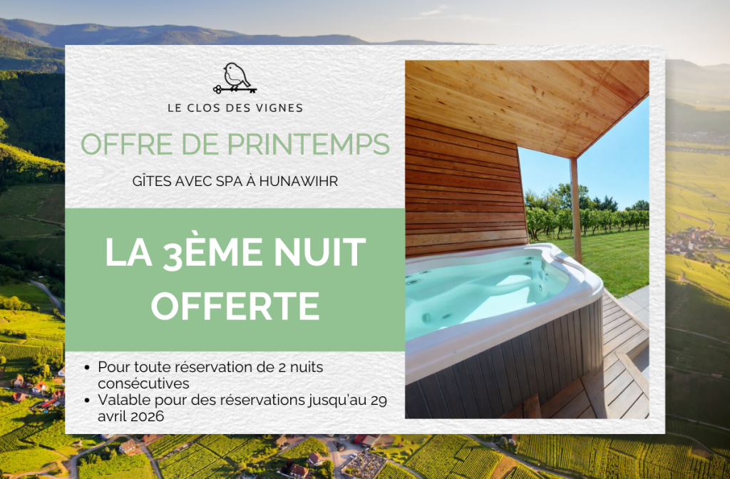 Jusqu’au 29 avril 2026, prolongez votre parenthèse de détente au Clos des Vignes et profitez pleinement de la saison sur la Route des Vins d’Alsace.